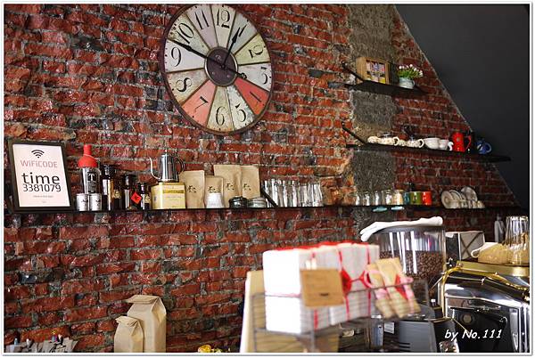 左手邊櫃檯後方則是懷舊紅磚牆掛著一個大時鐘