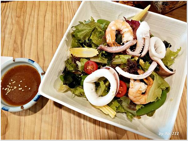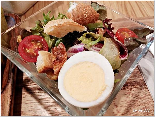 沙拉沾醬選擇的是凱薩醬,蔬菜新鮮又多樣,加上脆口的麵包丁,口感及味道都蠻有層次的