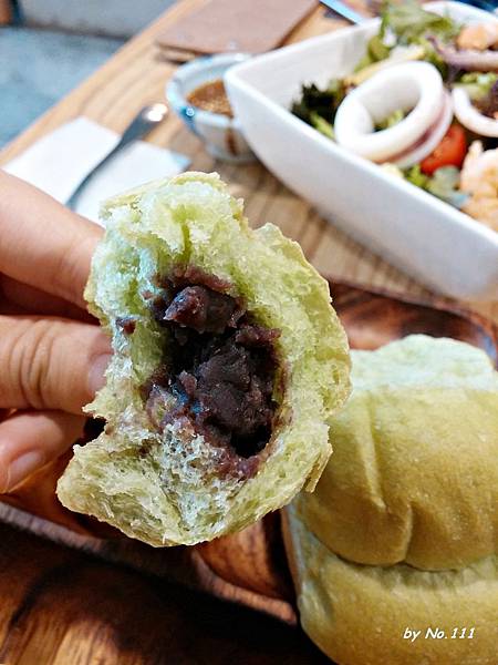 洋食套餐的主食是店家自製的手作麵包,這天是抹茶紅豆口味