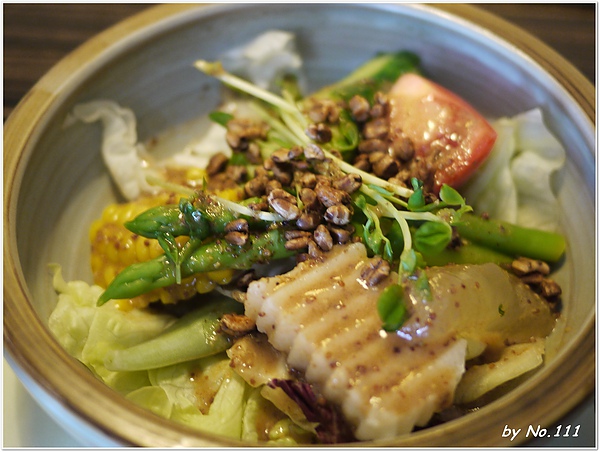 沙拉不是用美奶滋而是日式和風醬,味道比較清爽,鹹中帶有一點的酸